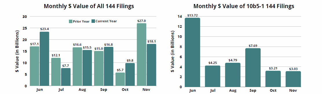 In November 2025, the total reported value of Form 144s surged 84% from October, primarily driven by a 126% increase in the value of discretionary filings. This month-over-month rise in value was also accompanied by an 94% increase in the number of shares registered for sale, and a 58% boost in number of filings. This increase in 144 market volume metrics between October and November is consistent with prior years. In contrast, the total value of 144 filings in November declined 33% from the year prior. This decrease is driven primarily by dramatic dips in the value and shares registered pursuant to Rule 10b5-1, 66% and 60% respectively. The decline in 144 volume metrics this year may suggest a return to normal after the AI-fueled mania in the markets last year.