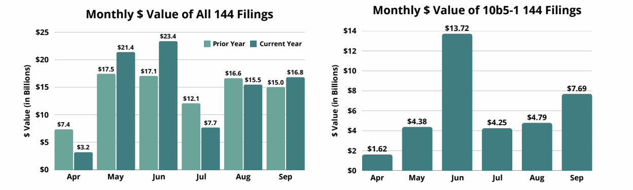 The total reported value of Form 144s rose 9% from August to September, driven by a 32% increase in the number of shares registered for sale. While the value of discretionary filings fell 15%, that was countered by a 61% rise in the value of filings pursuant to Rule 10b5-1. A similar trend was revealed when comparing September 2025 to September 2024; the value of discretionary filings decreased 13% and that of 10b5-1 filings advanced nearly 70%, resulting in a rise in total value of 12%. These metrics may reflect prohibitions during pre-earnings black out periods, at the same time that the market’s new highs trigger the selling instructions of insiders’ 10b5-1 plans.