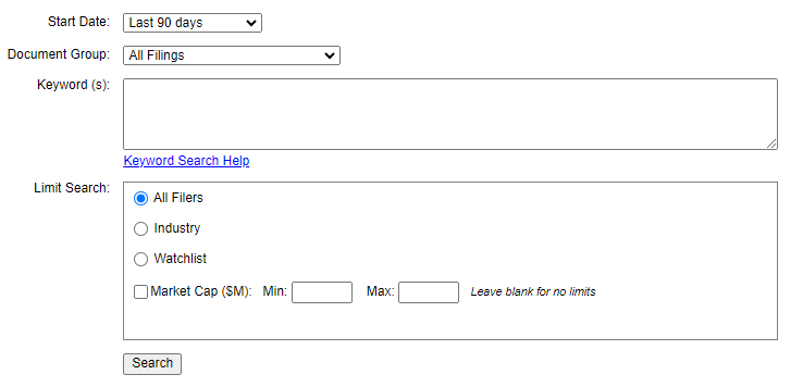 This highly versatile tool allows you to tailor searches for your specific needs and add them to your Saved Searches collection for later use. You can use advanced query syntax functions to filter for only the keyword results that you are looking for. Additionally, you can filter by date range, document group, Industry group, watchlist, and market cap.