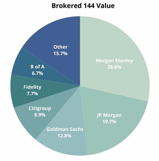 In August, Morgan Stanley maintained its first place spot in the broker rankings for value, shares, and filings. Additionally, JP Morgan came in second place for value and shares. Goldman Sachs rose to third place for value brokered, from its fourth place finish in July, due in part to their role in brokering last month’s largest filing (see next page). Citigroup advanced to fourth, and Fidelity slid to fifth place to round out August's top 5 brokers.