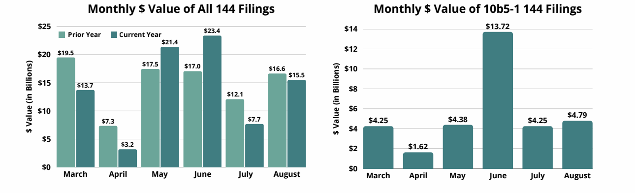 This August the total reported value of Form 144s increased over 100% from July, driven by a 212% rise in discretionary filings. There was a similar trend from July 2024 to August 2024, reflecting the end of pre earnings blackout periods and insiders’ ability to trade discretionarily again. However, this August’s numbers were largely in-line with those of 2024, specifically total reported value and number of filings. While the value of filings pursuant to Rule 10b5-1 increased 58%, that of discretionary filings fell 21% year-over-year. Insiders seemed to display more hesitancy this August than the year prior, while Rule 10b5-1 plans kicked in as the market reached new heights.