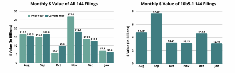 In January 2026, the total reported value of the 144 market fell 50% from December, accompanied by decreases in number of filings and shares of 36% and 6%, respectively. However, this is not unexpected, as there is typically a slowdown in the 144 market in January due in part to pre-earnings blackout periods. A similar decline in value of the 144 market can be seen from December 2024 to January 2025 as well. In comparison to January 2025, the reported value of discretionary filings last month rose 17%, whereas the number of non-planned shares surged nearly 100% year-over-year.