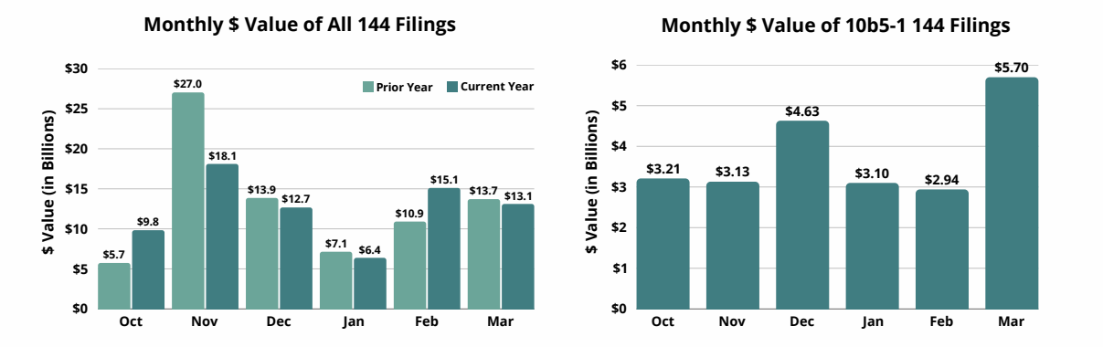 In March, the total reported value of Form 144s fell 13% from February, driven by a 39% decline in the value of discretionary filings. On the other hand, the value of 10b5-1 filings rose over 90%, accompanied by a nearly 200% jump in the number of planned shares month-over-month. There was a similar uptick in 10b5-1 activity year-over-year, with the value and number of shares of planned Form 144s increasing 34% and 114%, respectively. Conversely, there was a 4% decrease in total value from March 2025 to March 2026. The heavier reliance on Rule 10b5-1 plans this March may indicate insiders’ hesitation to make discretionary investment decisions during a time of economic and geopolitical uncertainty.
