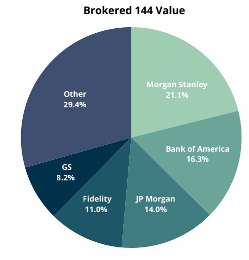 Morgan Stanley remained in the top spot for value brokered this March, their fourth consecutive month in this position. Morgan Stanley also claimed first for number of filings and second for number of shares. Bank of America once again claimed second, due in part to their role in brokering multiple of March’s largest Form 144s (see next page). JP Morgan rose through the ranks to take third for value and first for shares. Fidelity and Goldman Sachs slid to fourth and fifth, respectively. Fidelity also finished second for number of filings this March.