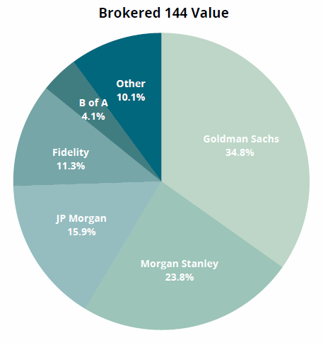 In November, Goldman Sachs advanced to first place in value and shares brokered, due in part to their role in brokering two of last month’s largest 144 filings (see next page). Morgan Stanley fell to second place for value and shares, but held onto first place for number of filings. JP Morgan slid into third place, with Fidelity remaining in fourth place. Bank of America dropped to fifth place from its third place finish in October, rounding out November's top 5 brokers.