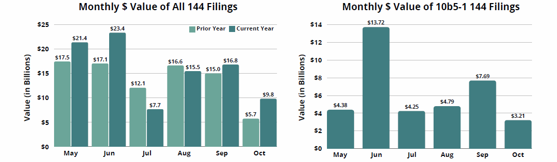 The total reported value of Form 144s fell 42% from September to October, accompanied by decreases in the number of shares registered and number of filings. This dip in Form 144 activity between September and October can be seen in prior years, due primarily to pre-earnings blackout periods. On the other hand, when comparing October 2025 to October 2024, the value of 144s rose 71%, driven by a 136% increase in the value of discretionary filings. This year-over-year increase in total value contrasts with the 6% decrease in the number of shares registered, indicating that the rise in value this October is probably driven by the market’s rally to new highs rather than increased share volume.