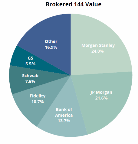 In October, Morgan Stanley once again took first place in all three categories. JP Morgan advanced to second place for total value brokered, due in part to their role in brokering three of last month’s largest filings. Bank of America rose to third place for value, and also claimed second place for number of shares brokered. Fidelity secured fourth place in value brokered and second for filings. Charles Schwab rounded out October’s Top 5 Brokers.