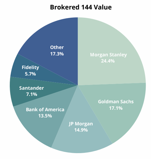 For the fourth month in a row, Morgan Stanley claimed first place across all three metrics: value, shares, and filings. Goldman Sachs rose to second place for value brokered from its third place in August. JP Morgan slid to third, while also taking second for shares brokered. Bank of America advanced to fourth place this September. Newcomer to the Top 5 list Santander rose through the ranks to place fifth for value, due to their role in brokering last month’s largest filing.